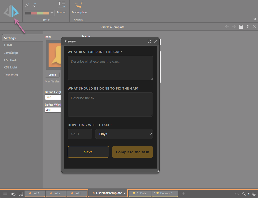 The User Task designer in Formulate, allows users to create their own task interfaces, functionality and logic using a combination of HTML, CSS, JavaScript and Pyramid's task API. They can be further extended to work with external applications through their APIs. Saved User Tasks are sharable, reusable and governable like all other elements in the Pyramid Catalog.