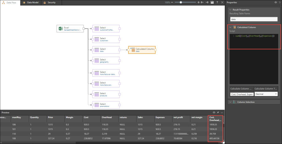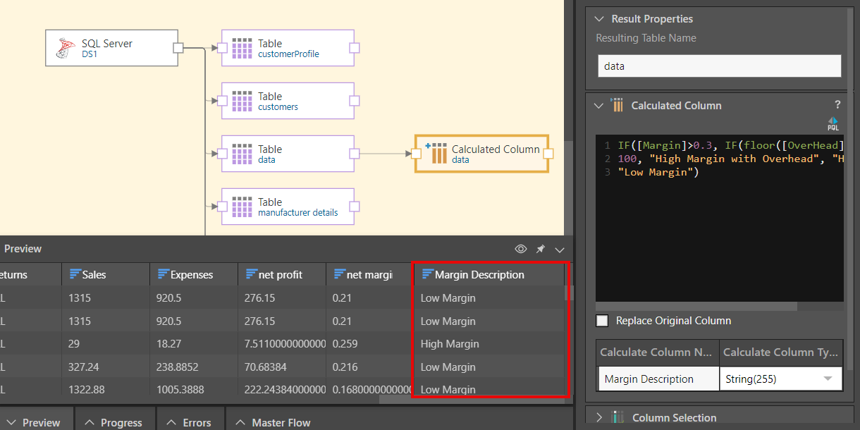 In this example, an If statement is entered into the script window, to generate a new column that will return a result of either High Margin or Low Margin, based on the Margin and Overhead columns. If the margin is greater than 0.3, the calculated column will return High Margin; if it's equal to or less than 0.3, it will return Low Margin: