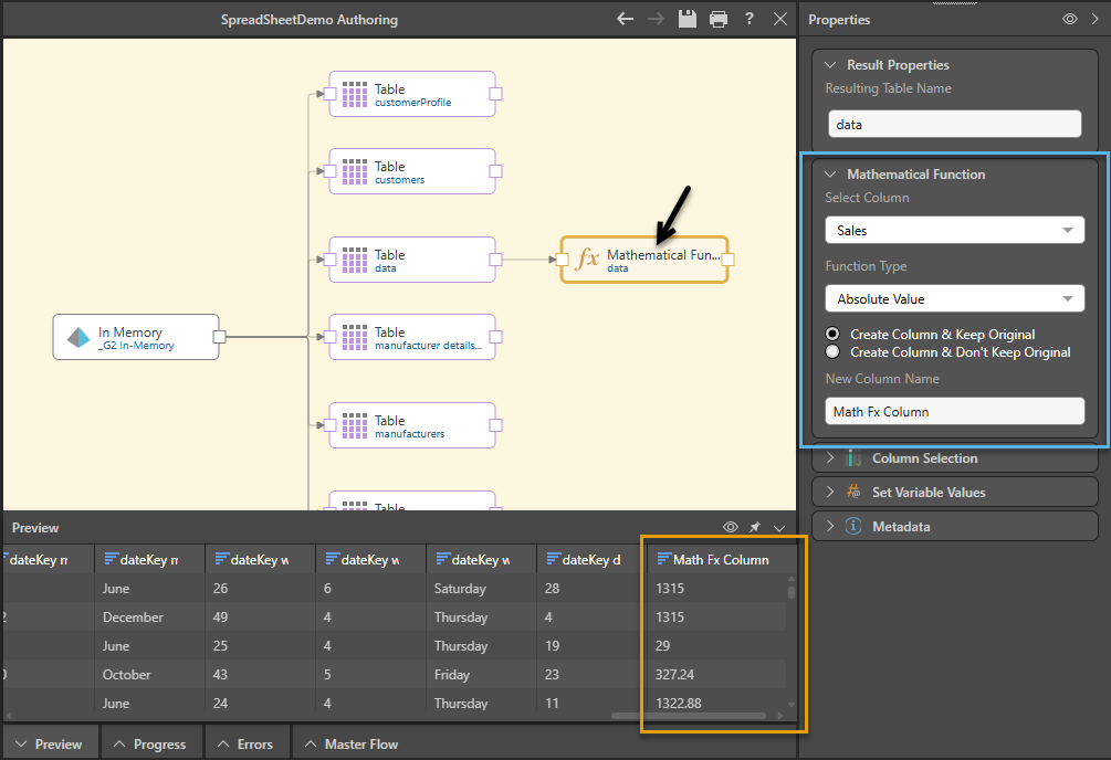 Connect the Mathematical Function node to the Select tables of the relevant table.