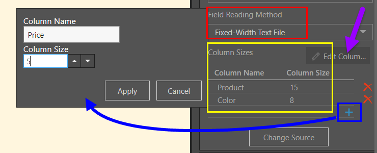 If you have fixed-width text file, you must select this option as the reading method (red highlight below), and add the column names and sizes (number of characters in each column) under Column sizes (yellow highlight). You can add one column at a time by clicking the plus sign (blue highlight) then entering the column name and size (blue arrow), and clicking Apply.