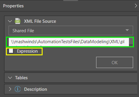 Enter the file path of the shared file (including the file name and extension) in the File Path field (green highlight below). Enable 'Expression' (yellow highlight) to provide the file path in the context a dynamic PQL expression, created in the PQL Editor.
