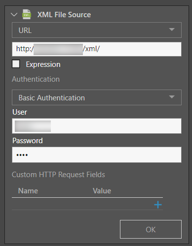 To connect to an XML file via its URL, paste the URL in the Set URL field. Enable 'Expression' to provide the URL in the context a dynamic PQL expression, created in the PQL Editor.