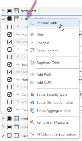 Columns can be categorized using Pyramid's AI column categorization feature. Right-click on the table name (purple arrow below) and select AI Column Categorization from the context menu. The system will generate categories (if applicable) for all columns that have not been assigned to a category.
