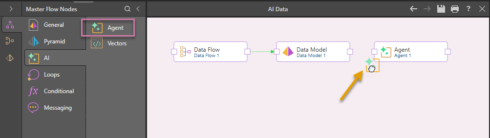 - From the AI options in the Master Flow Nodes panel, drag-and-drop Agent onto the canvas:
