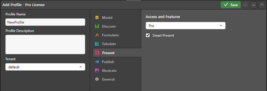 - Smart Present: Grant access to the Smart Reporting tool from Present; this option is supported for Pro and Analyst users.
