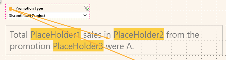 At runtime, make a selection from the slicer. Your selection is used to replace PlaceHolder3 and is bolded: