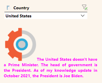 Note: This example shows why AI-driven responses are so powerful. Even where the request does not make sense for the given region (there is no American prime minister), the response may be meaningful to your user.