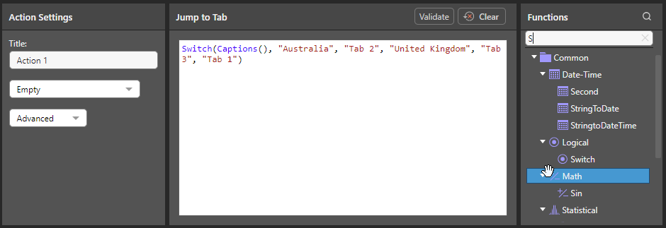 Define advanced actions if you want to use PQL Functions to write an expression in the Jump to Tab window when particular values are selected from the slicer. You should use this advanced feature if you want to use the PQL functions to create a switching or conditional effect, or otherwise apply additional logic to your action.
