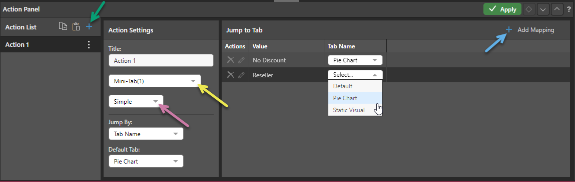- If you want to jump to tabs in your mini-tab container when specific values are selected from the slicer: - Select Simple (purple arrow).