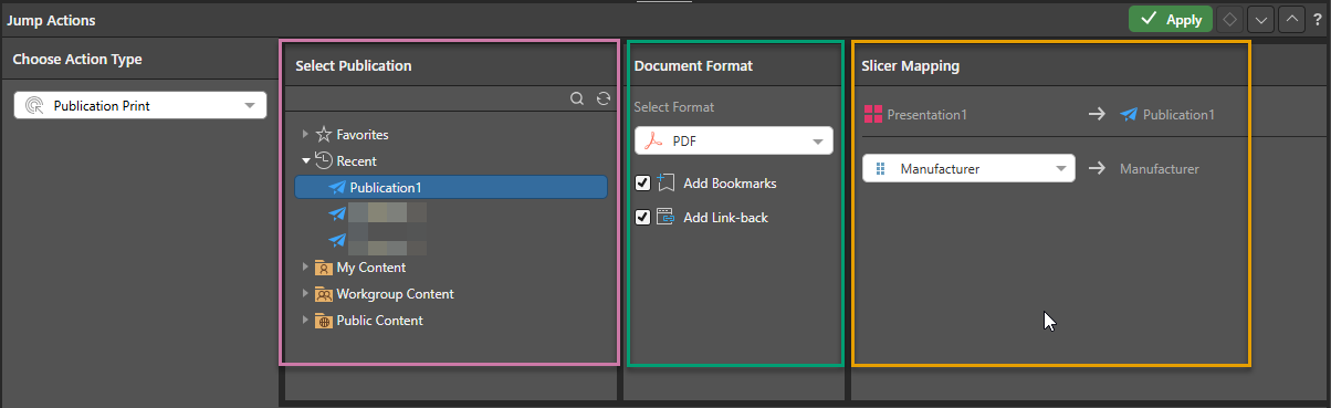 The Slicer Mapping panel (orange highlight above) opens if the presentation containing the jump action and the selected target publication contain matching slicers. This mapping indicates which slicers in the presentation map to which slicers in the publication, so that your slicer selections can be passed from the presentation to the publication when it is printed.