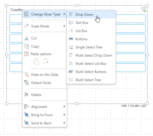 Slicers help your readers to filter or narrow-down the information that they see in their presentation and can take different forms to satisfy different reader requirements. Those forms (or slicer types) can be changed when you are designing your presentation. As an example, you might switch from a dropdown list to buttons (or vice-versa) to improve the usability of your presentation; buttons may be quicker to use and let you see all options at-a-glance, while dropdown lists save space when there are many options.