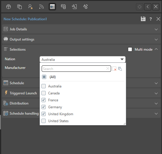 After defining the condition, proceed to the schedule panel and choose which slices should be used to filter the publication. Of the selected slices, only those for which the given condition is met will be used to filter the publication.