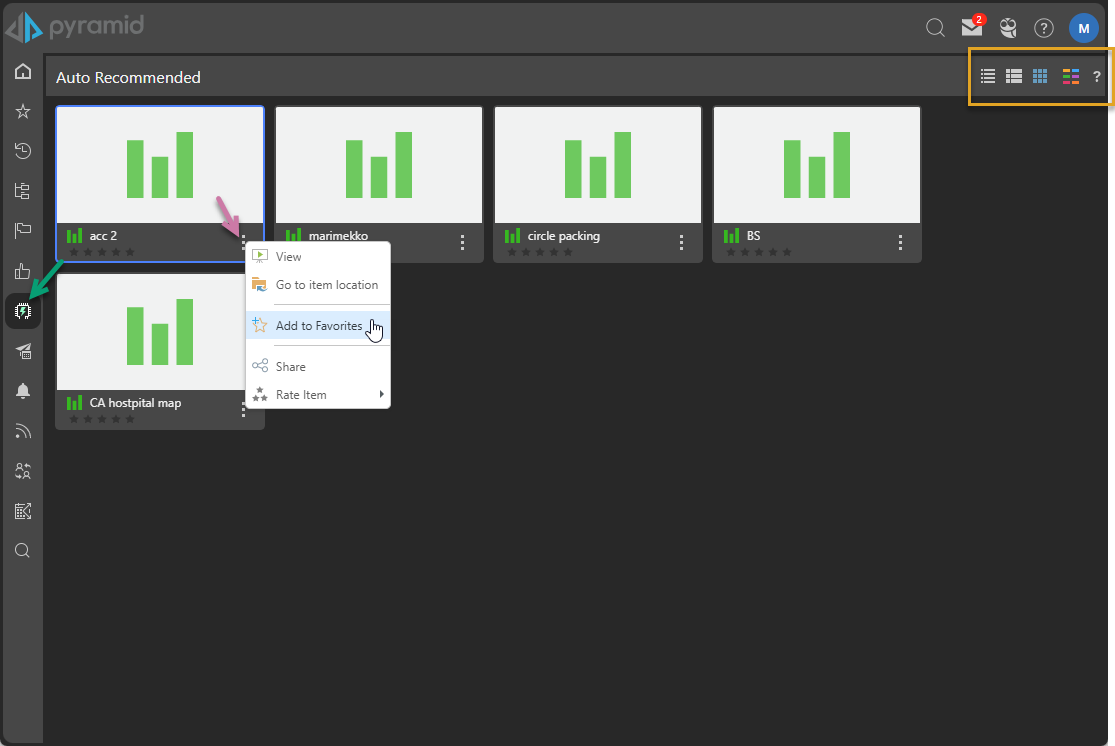 The Auto Recommended view, which contains content items that have been identified as relevant to this user automatically, is indicated using a Certificate icon. For both the Pro and Analyst versions of the CMS, this icon is hidden by default. You need to click the ellipsis menu to show the submenu.