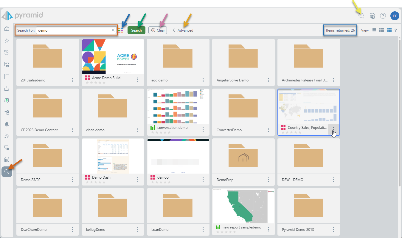 - Content Type Filter (blue arrow above) - this allows the user to narrow down the types of content to search and return: All, Folders, Model, Discover, Formulate, Tabulate, Present, Publish, and Illustrate.
