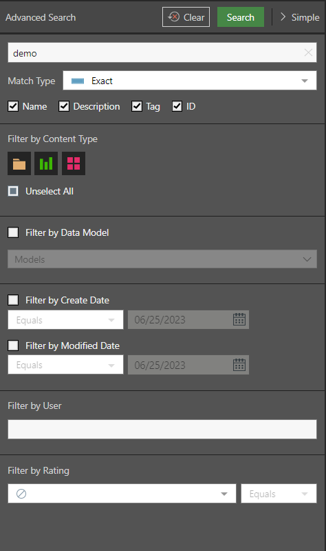 - Match Type: Allows the user to change the type of match performed on the search terms. Users can be searched by Name, Description, Tag, or ID associated with the content.