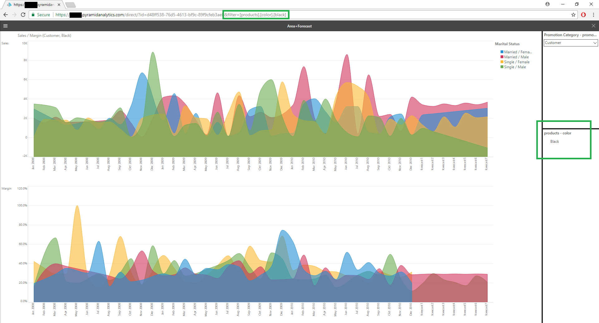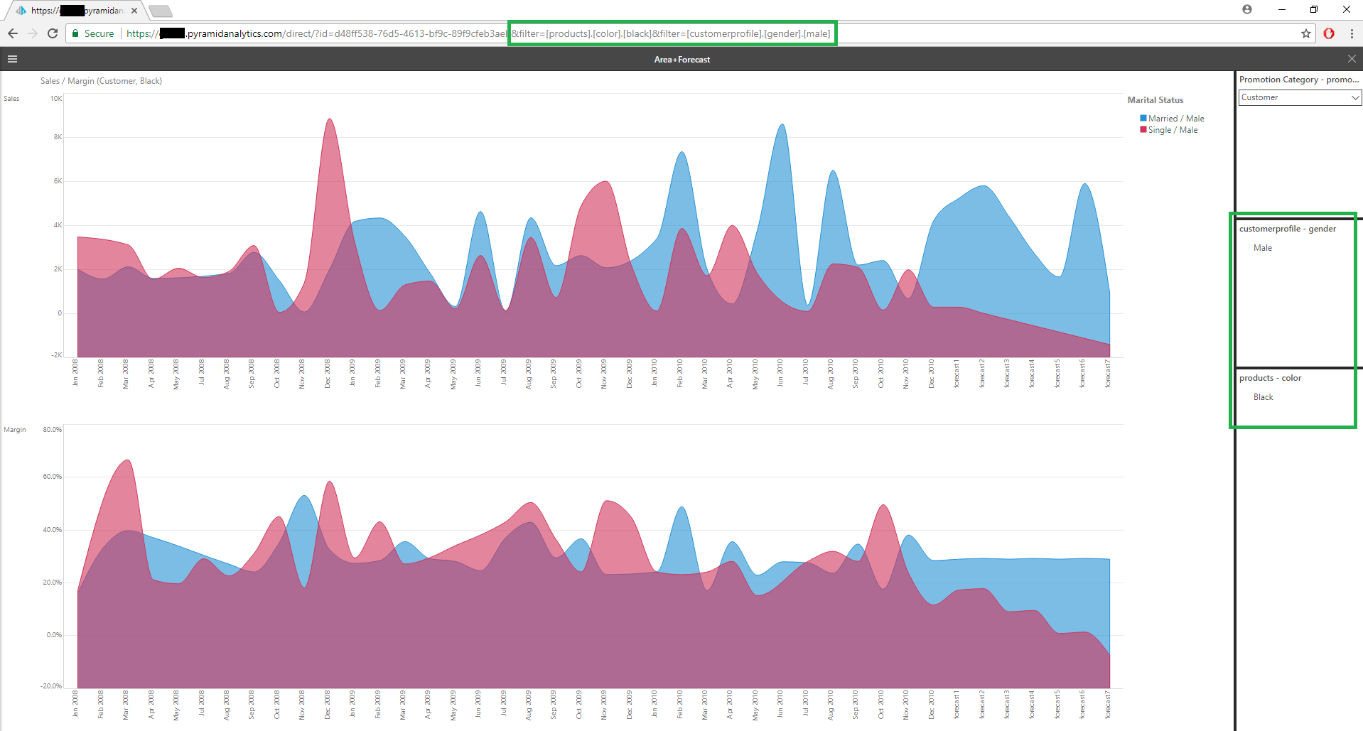 When you directly access a visual using its URL, you can filter its content by adding one or more filter parameters to the URL's query string. This effectively adds a background filter to your visual at runtime.