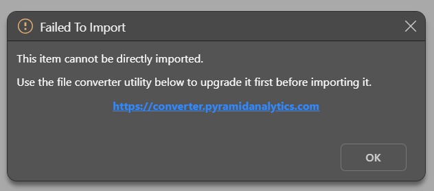 From Pyramid 2025.02 onwards, hardened security infrastructure has necessitated a change to the internal format of PAT files. If you are importing an older PAT file (exported from Pyramid 2018 or Pyramid 2020 versions) and receive the following error message, follow the provided link to an online utility to convert older PIE and PAT files to the new format.