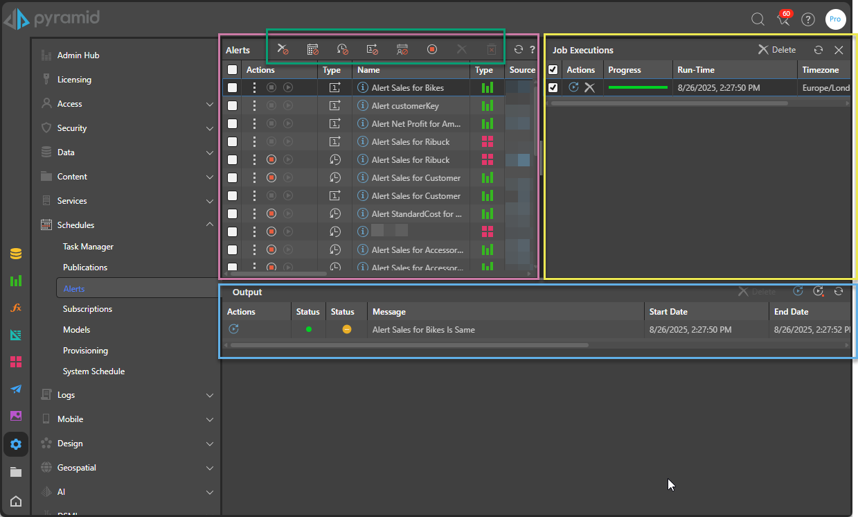 The Alerts Schedules page allows administrators to view and manage all existing alert schedules, their associated executions and rendered alert messages.
