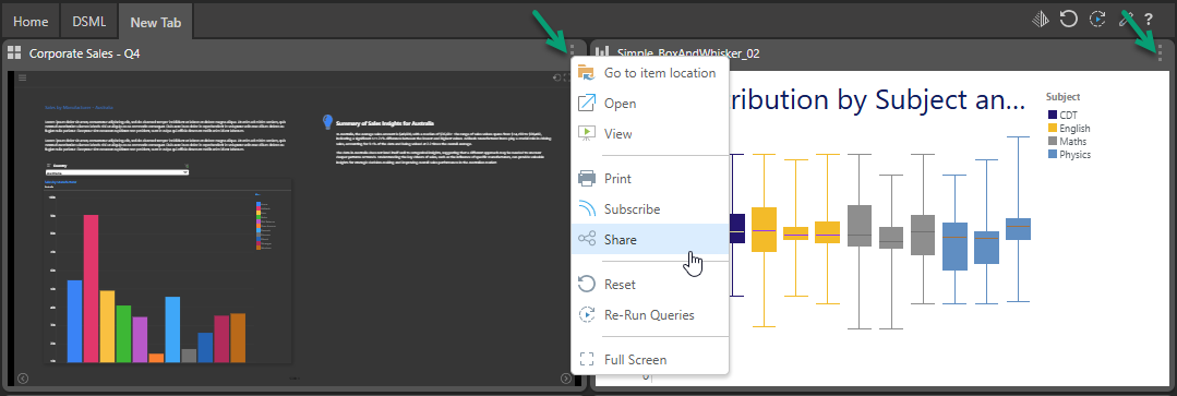In this case, you can access a range of features via various context menus, which are exposed from the containers, the visuals, and the visual backgrounds.