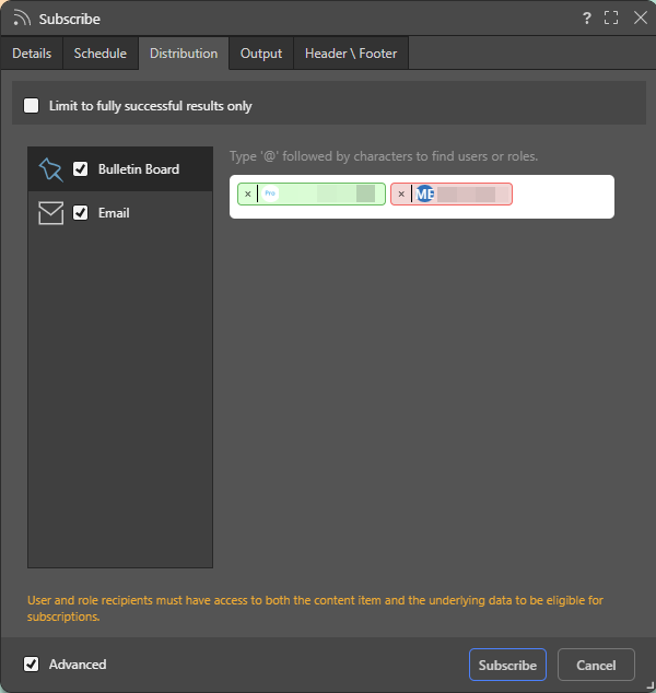 Where the User Subscription mode is Normal, users can subscribe to discoveries, presentations, and tabulations for themselves and also on behalf of any other recipients using the Distribution options. In this case, the reports are built as the initiating subscriber (that is, the user creating the subscription) and distributed through the Bulletin Board, by Email, by Mobile, or using webhook Channels.