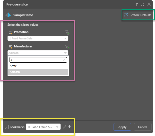 - Next time you open the Pre-query slicers dialog, your bookmark will appear in the Bookmarks dropdown list. Select the required bookmark and click "Apply" to load the query.