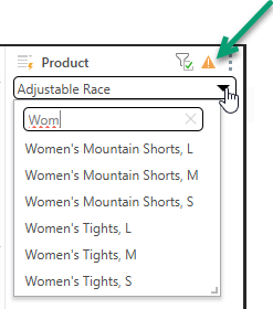 Note: If the items in the slicer hierarchy exceed the slicer limit, the list is truncated. You can, however, still find all items using the search facility. For example, an alphabetical product list may be cut off before it reaches "W" in the drop-down, but items starting "Wom" can still be found using the text search (see above).