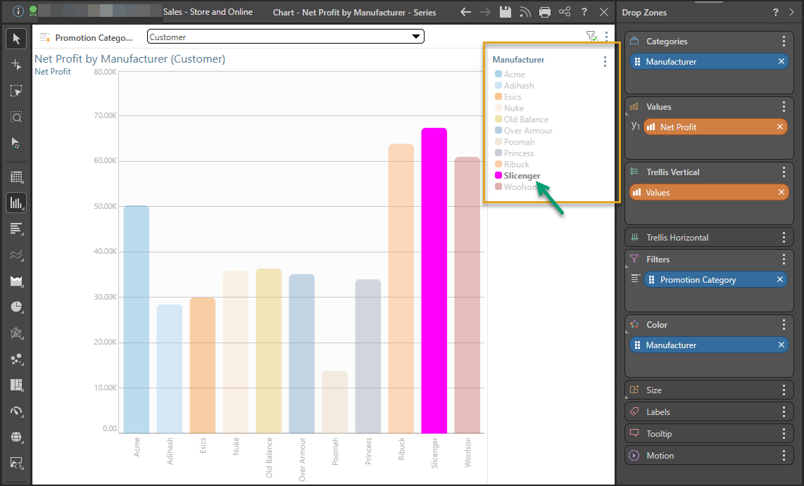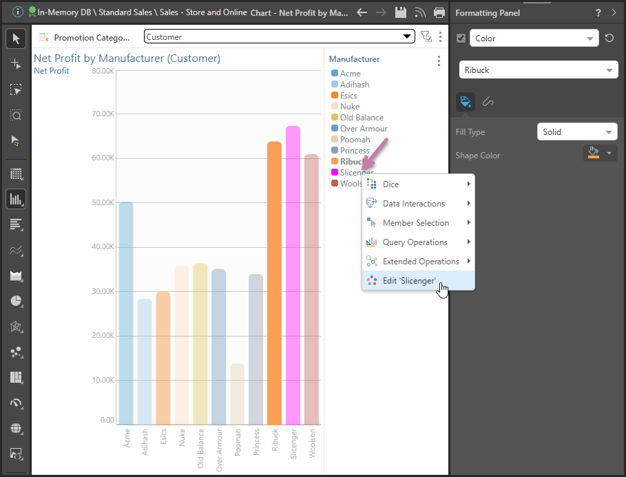 Series editing offers the flexibility to override theme colors for the given series, without changing the theme itself. For example, in the image below the Slicenger series was changed from pale gray to bright pink: