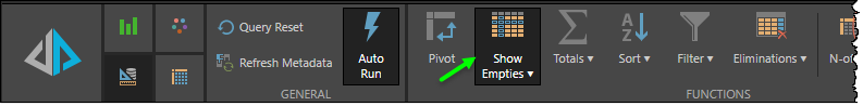 It is not unusual to have sparse data in a data model. This, in turn, produces null or blank results when a user builds a query and the resulting visualization. By default, the "empties" are suppressed by Pyramid, to remove the empty 'noise' and sparsity from the query - which usually produces cleaner more useful analyses. However, there are times when a user wants to see the blank items. The Show /Hide Empties function allows a user to control this setting.