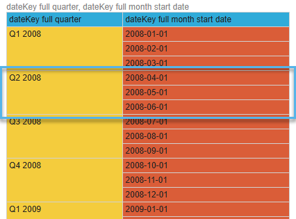 - You also cannot use Full Month Start Date to provide the Sort order for your Full Quarter column, since Pyramid will be unable to tell which of the possible dates is the correct start date for the quarter (in the blue box below, you can see that the start dates identified for Q2 2008 could be one of 1st April, 1st May, or 1st June):