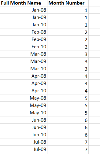Instead, we sort by the Full Month Start Date Column and end up with a list of months in the correct chronological order: