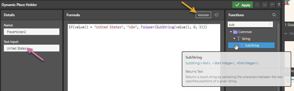 - Test that the formula behaves as expected by entering a valid value into the Test Input field (purple arrow above) and clicking Validate (orange arrow):