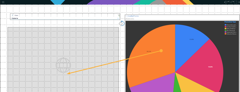 - Alternatively, select the Interaction Picker in the Toolbox (purple arrow), click the slicer or visual that you want to affect the web panel and drag your cursor to the web panel to create the interaction: