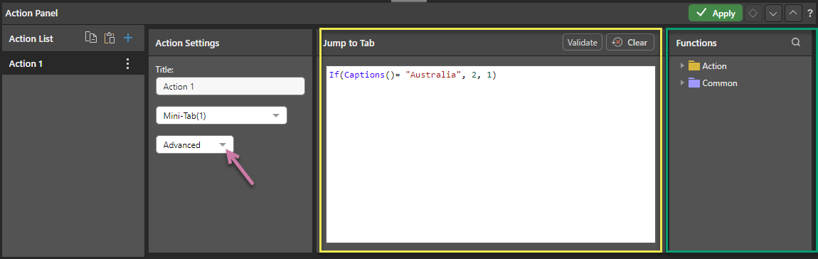 - Choose Advanced from the Action Settings panel (purple arrow below).