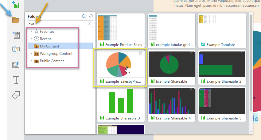 Add existing analytic content (Discover visuals or Tabulate visual areas) to your publication from the content management system or by dragging open items in from the App Tabs. These content items were typically created by you or your colleagues using Discover or Tabulate and saved to a shared location; reusing them in this publication ensures that you are always including the latest underlying analytic data from your team.