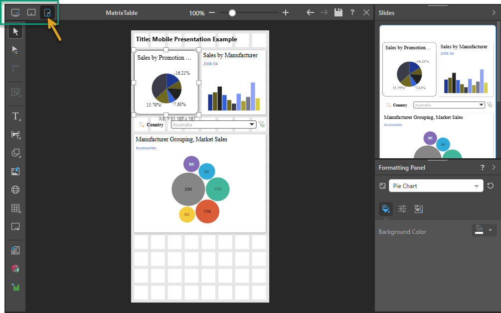 - By clicking the Mobile device type icon (orange arrow below) in your existing presentation, thereby creating a new Mobile device type layout inside your existing presentation.