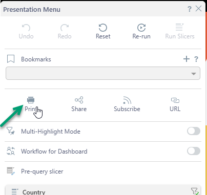With the presentation open at runtime, click the hamburger menu at the top-left corner of the slide and then select Print from the panel that opens: