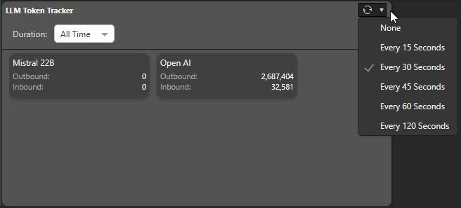You can add a custom LLM Token Tracker panel to a tab on your Admin Hub from the available widget presets. This panel shows the tokens that have been sent and received by the Chatbot while it is in operation, organized by LLM provider.