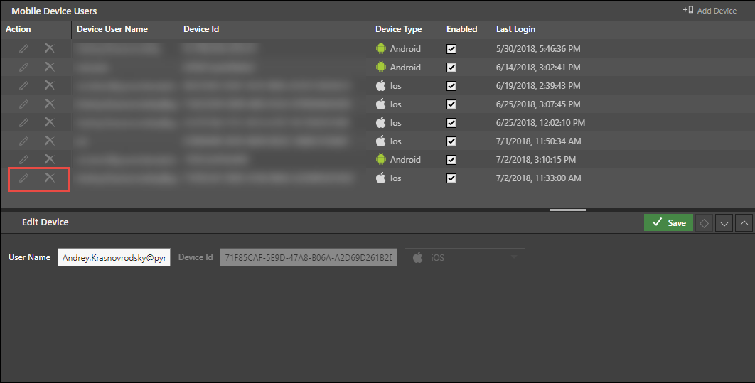 For each device you'll see the Device User Name, Device Id, Device Type (IOS or Android), Enabled status. and the date and time of the Last Login from that device.