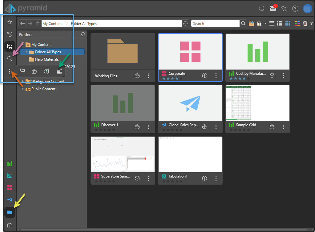 This is the master content view. A folder and item interface allowing users to organize and manage their content and folders. For details, see Content Explorer for Analysts.