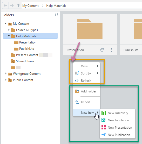 Most of the options on the Background menu relate to managing the view, but a key function available here is the New Item option, which allows you to create a New Discovery, Tabulation, and so on, in your required Content Management location and with your selected name.