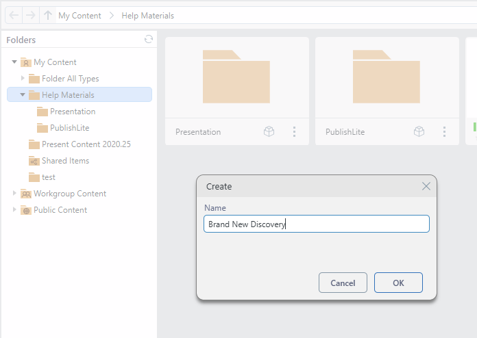 If you have write access to a folder in Content Explorer, and your license entitles you to create a content item of a given type, you can create a New Item by right-clicking some empty space and choosing New Item > New <Item Type> from the context menu. Once this option is selected, you will be prompted to provide a name for your new item before you can begin the standard creation process. The New Item Type is created in the current folder.
