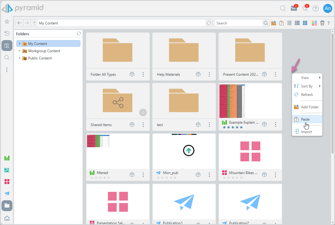- Right-click a folder in the tree and Paste from the context menu to paste the items into that specific folder: