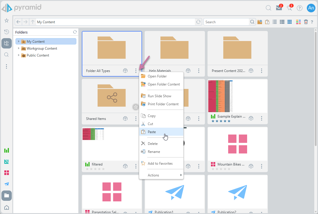 - Click the menu for a sub-folder item in the item listing panel and choose one of the paste options from the context menu to paste the items into that specific folder: