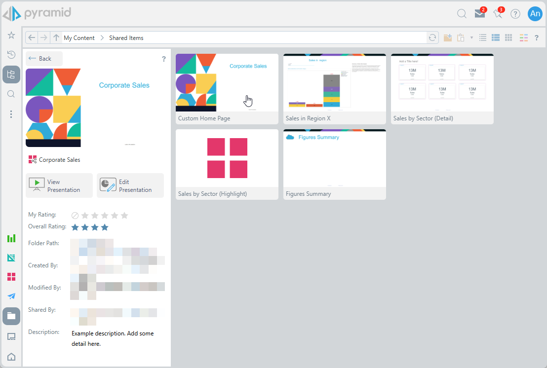 When opening presentations from the Content Manager, the default action is to open the presentation at runtime. This effectively opens the dashboard content in "show mode" for immediate viewing and consumption, rather than editing. You can configure the view function to either open the presentation directly on the first slide or let the user see a preview of all the slides first and allow them to pick their own starting point using the Presentation Launcher.