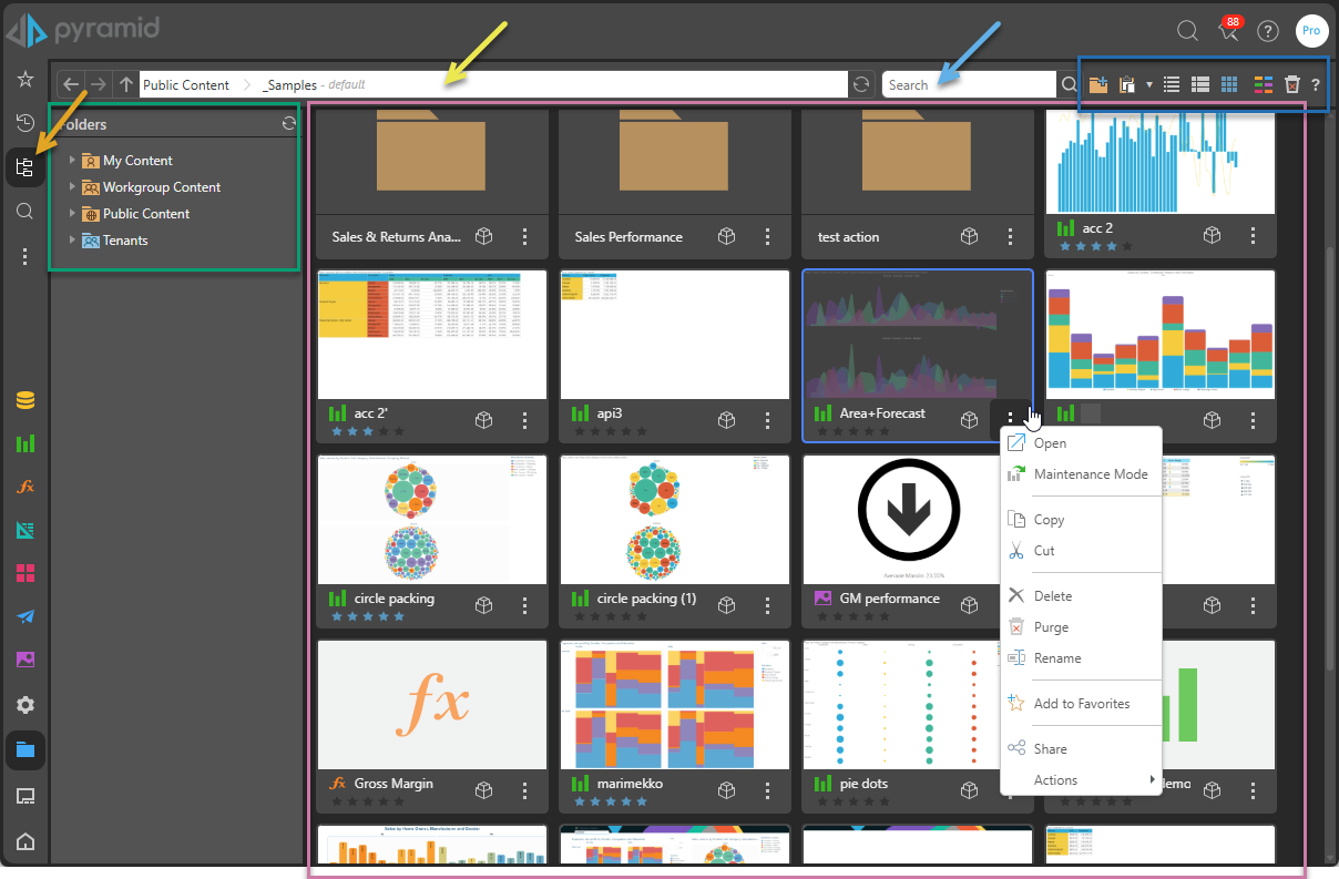 The "item listing" (purple box above) is visible in every content view, not just the explorer. It shows a list of content items that match the selections, search, filters, and so on selected on the page. The listing contains files of all of the content types (associated with the apps: Model, Discover, Formulate, Tabulate, Present, Publish, and Illustrate), and also sub-folders, which are contained within the selected parent folder.