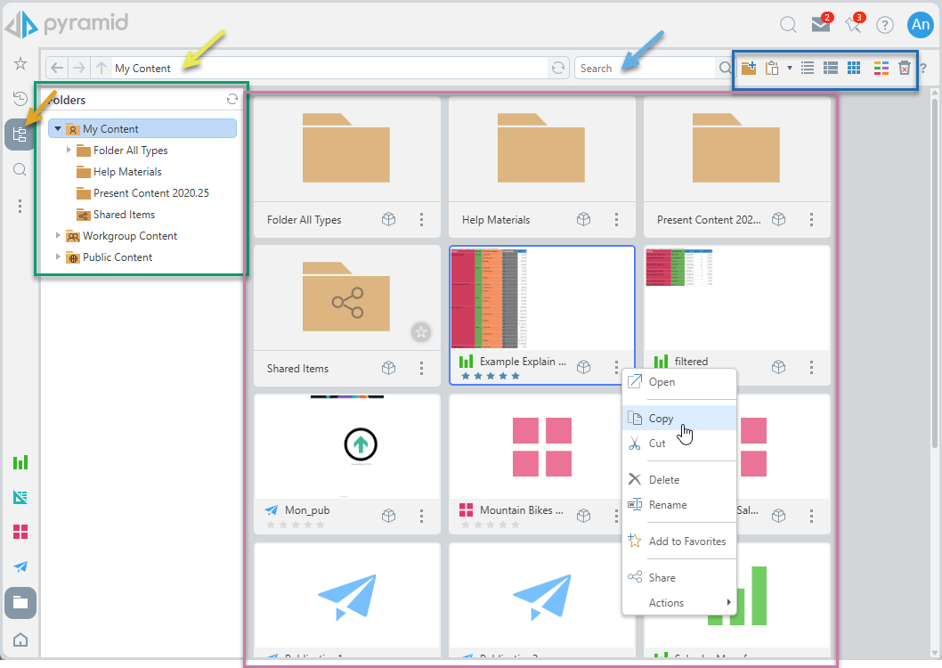 The explorer functions are split between those affecting the folder tree (green box) and those affecting the items (purple box). In some cases, there are common actions between these two elements while there are also similar actions that behave differently depending on whether the target is a folder or content item. Finally, many of the actions can be accessed from multiple content views in the content manager and are not exclusive to the explorer view.