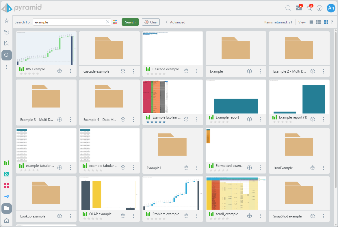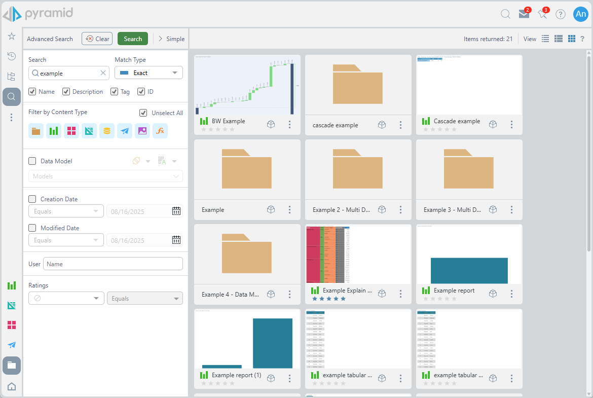 Use the search bar in the content search view to supply as many or as few elements of the search mechanism. Typically, the search term is supplied, and then the user clicks Search. The results are shown in the view with a summary count of the items returned in the bar (blue box above).