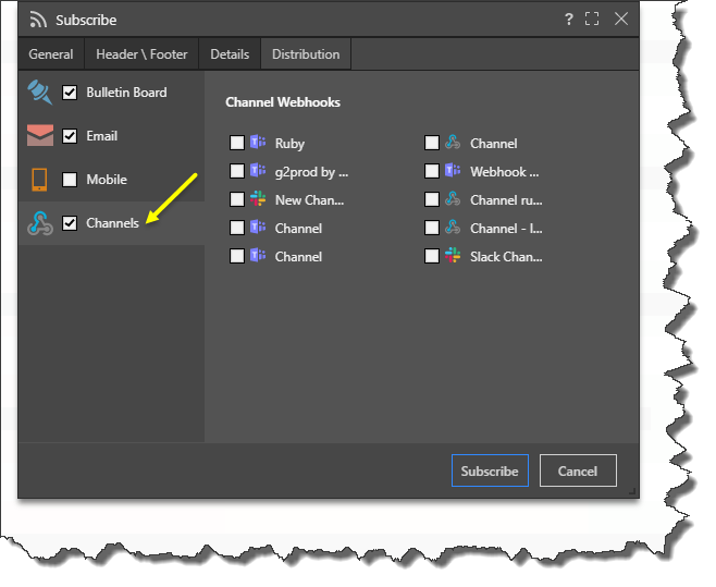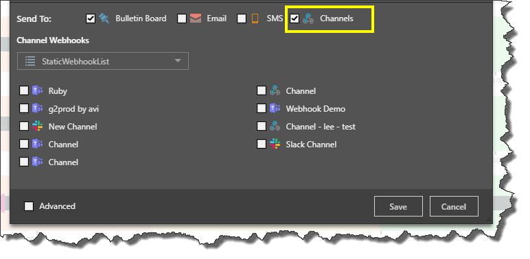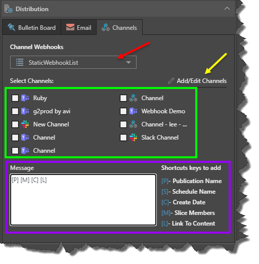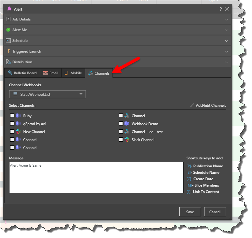 Webhook distribution of advanced alerts is configured in much the same that it is for publications. You can distribute to an existing channel, edit a channel, or add a new channel, and you can write a message.