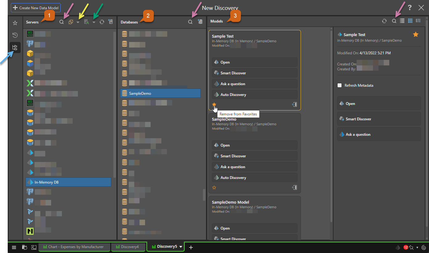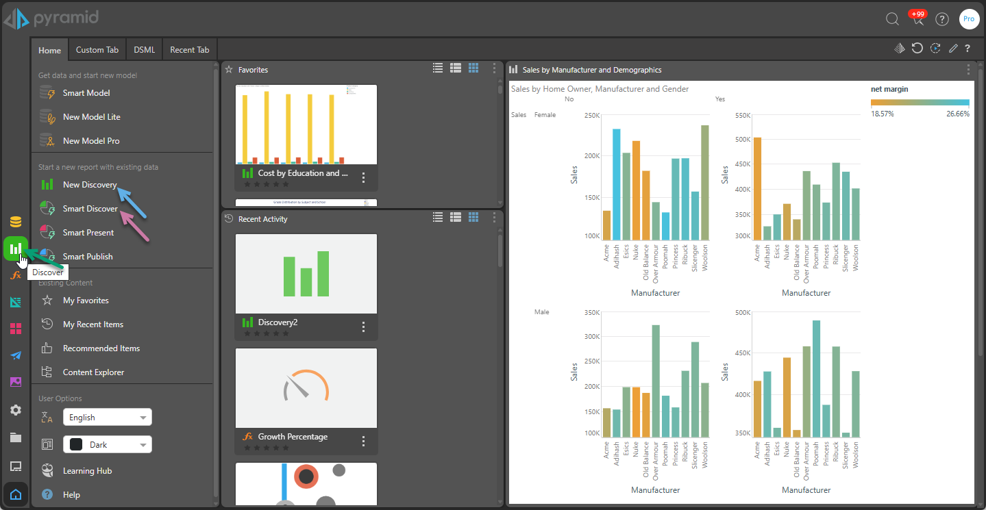 From the Hub, you can create a new discovery by selecting New Discover (blue arrow above) or Discover in the App Toolbox (green arrow). Alternatively, you can click Smart Discover (purple arrow above).