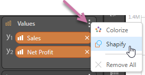 The Shapify function in the Value drop zone's context menu allows you to use Measures to drive the shape of your data points.